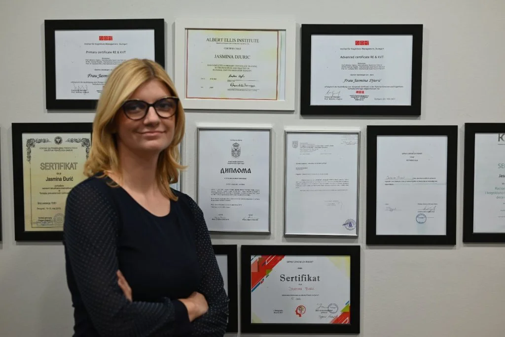 - Sertifikat o završenoj edukaciji za psihoterapeuta pri Srpskom centru za RE&KBT u Beogradu.